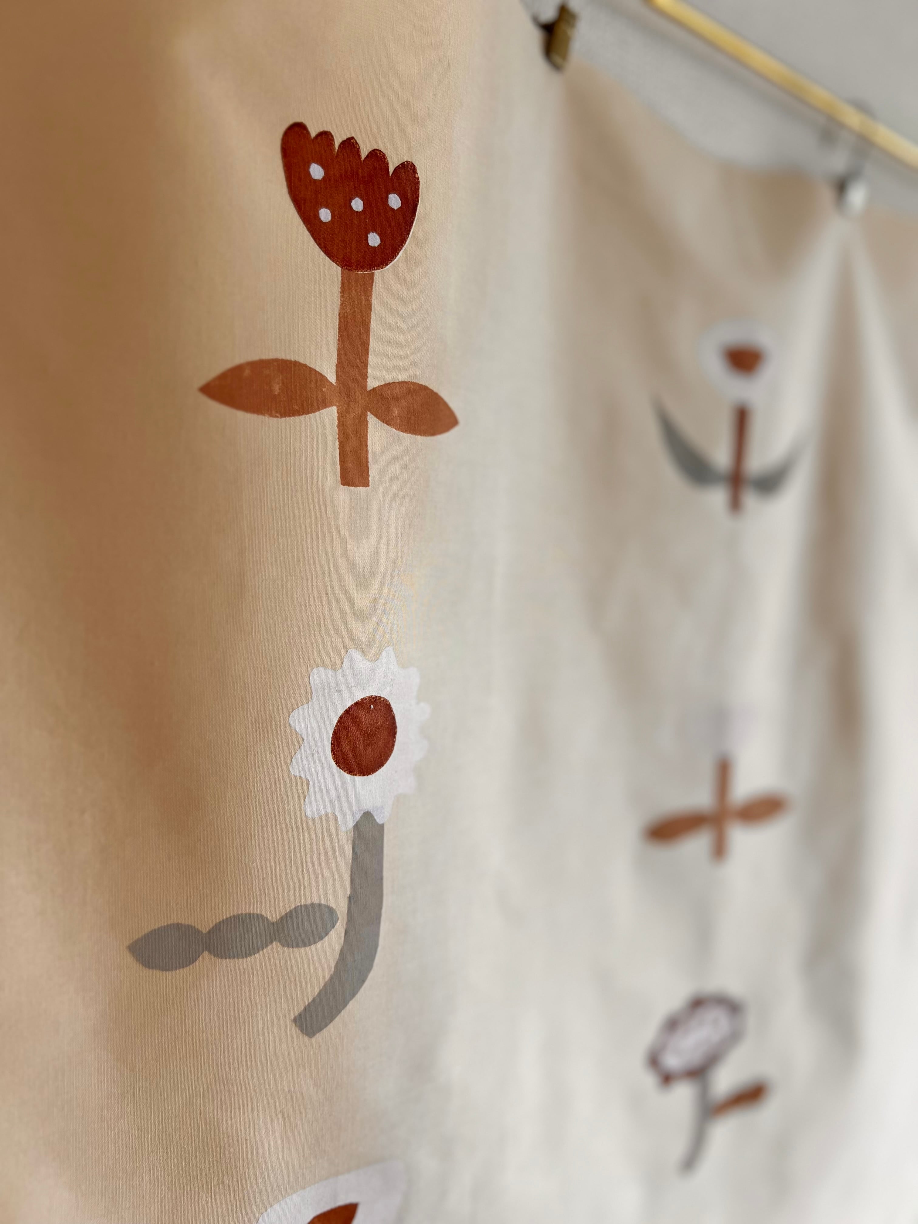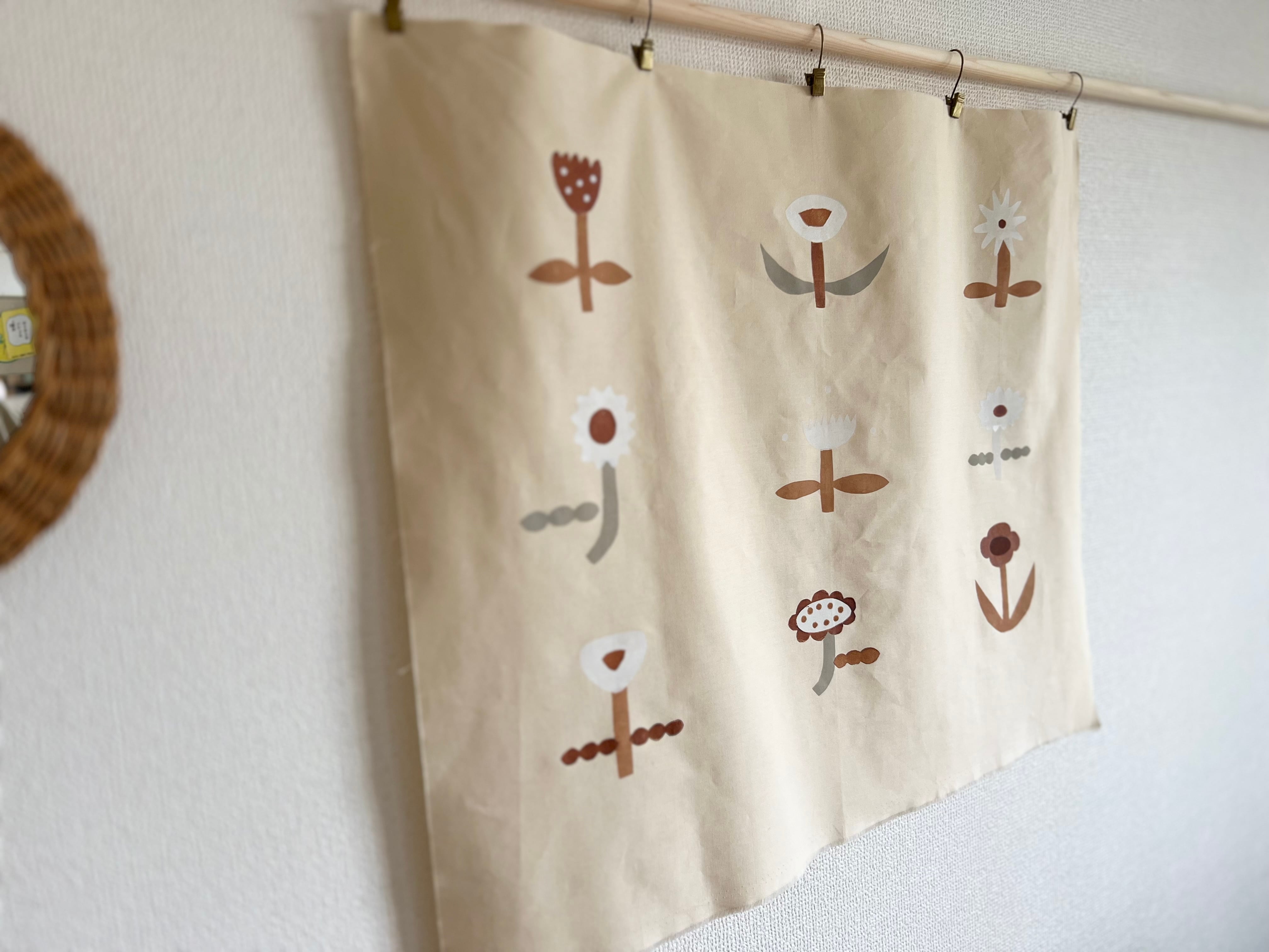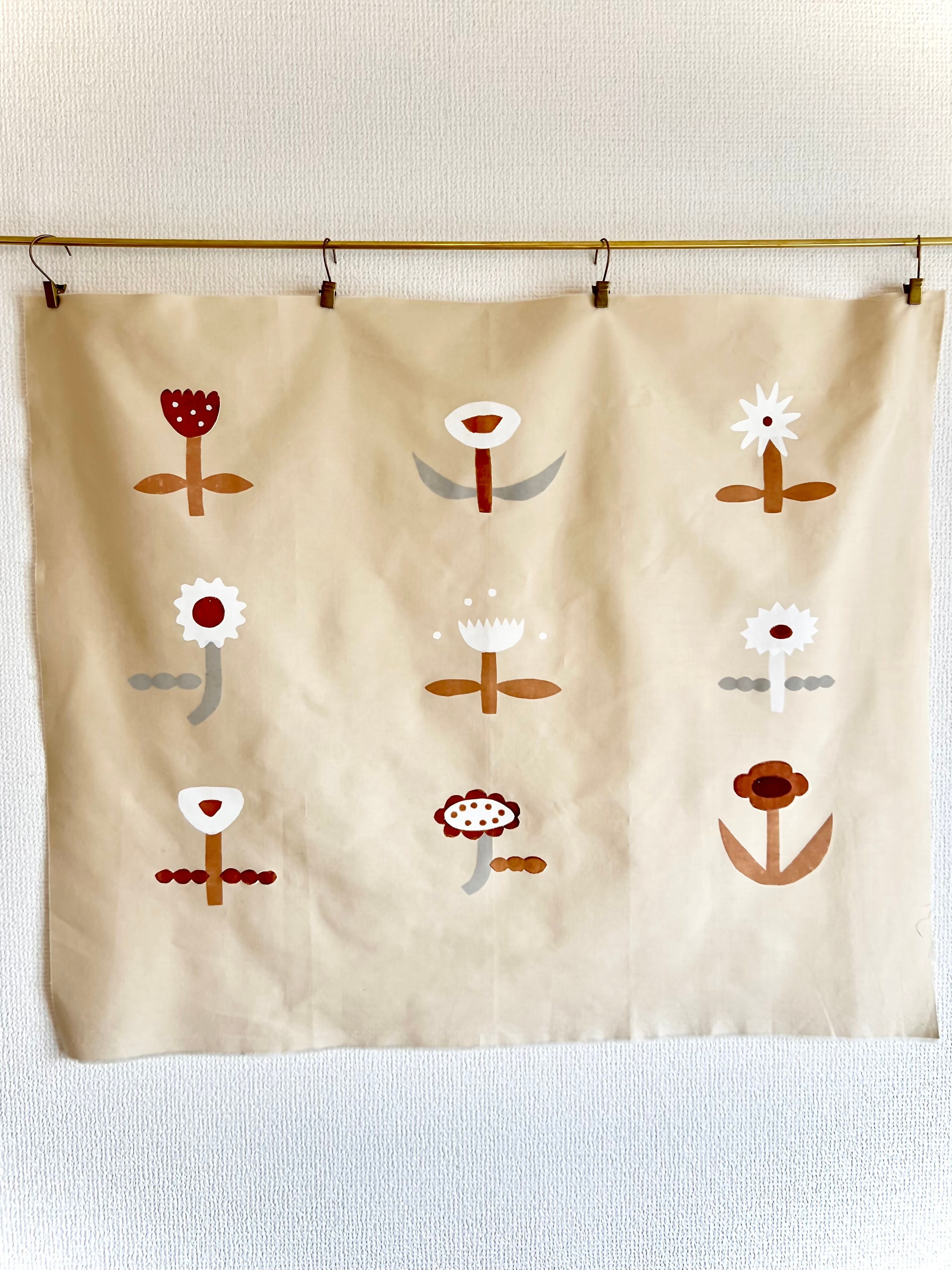 ベージュの布に、同系色のお花をデザインしました。お部屋になじみやすいtextileです。